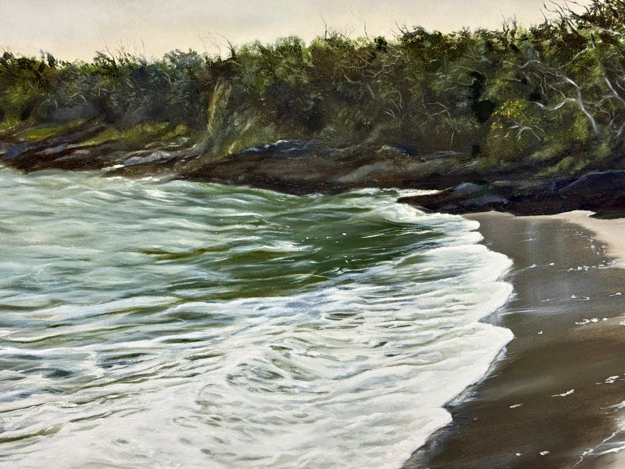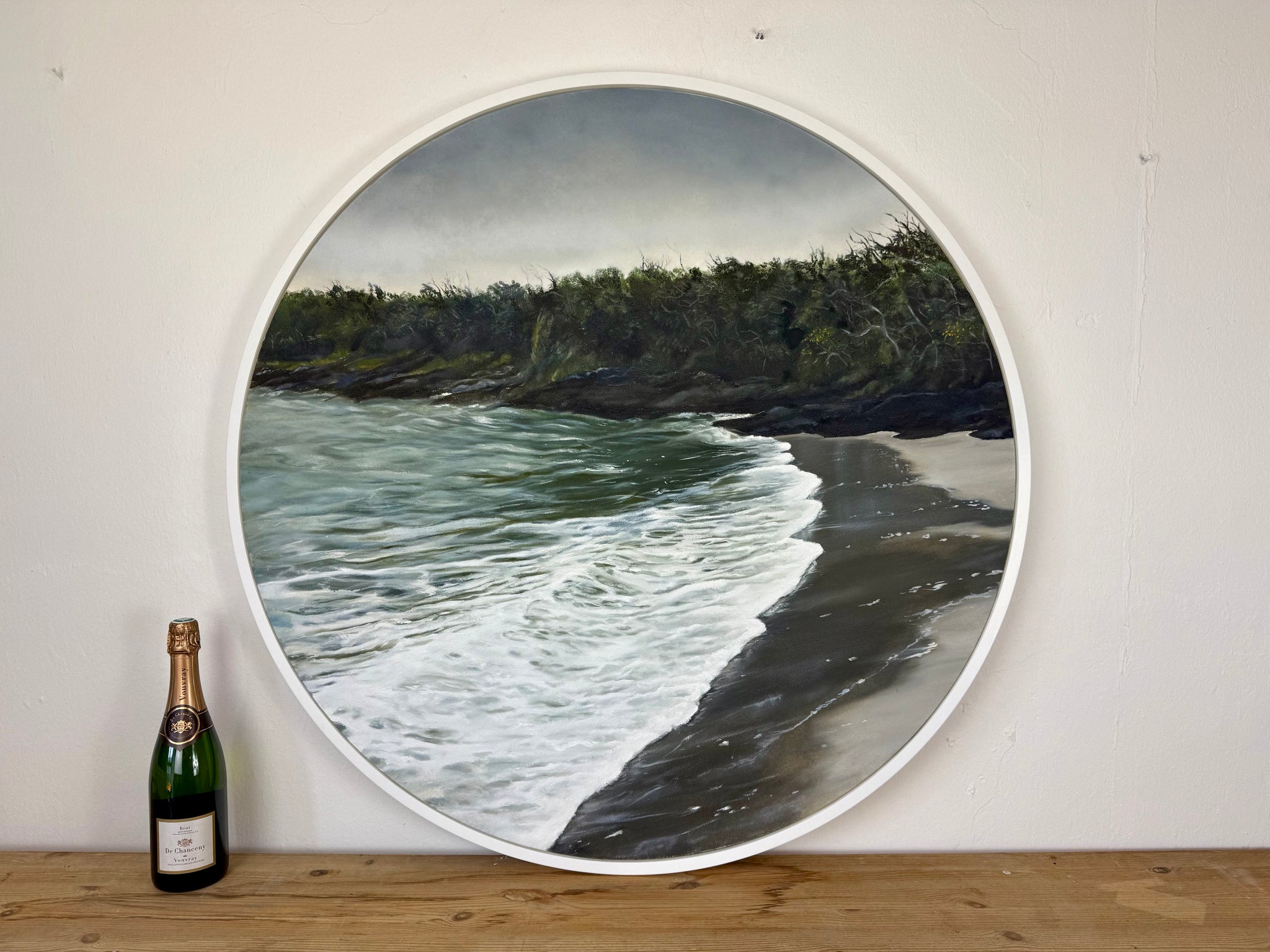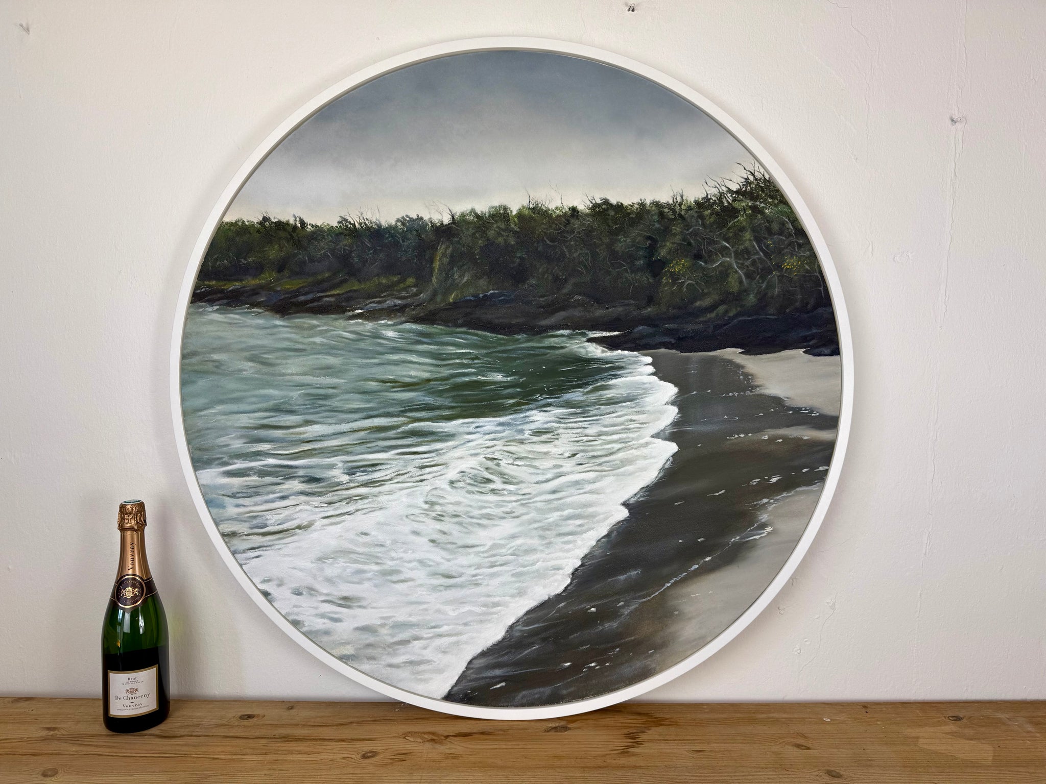A stunning painting of a west cork beach. 97 circle inc frame. Made with natural hand made paints