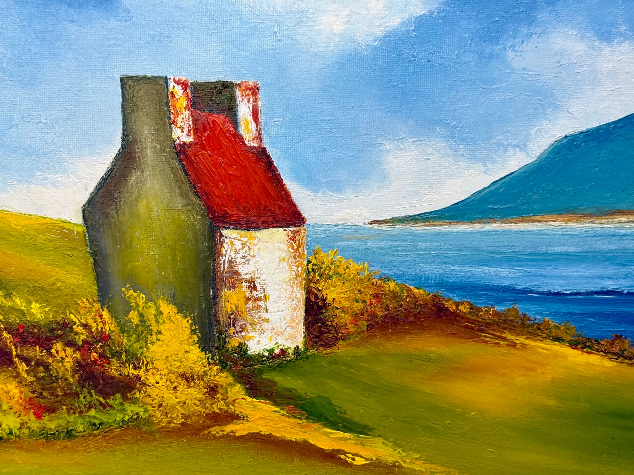 From Drimoleague, I found one of her paintings on the floor at the framers and when I asked James, he filled me in on the fact that she only painted for friends and family as gifts, as she didn’t think she was good enough. How wrong she was. She took a bit of convincing but sold her first two paintings on the same day I hung them and has been flying ever since.