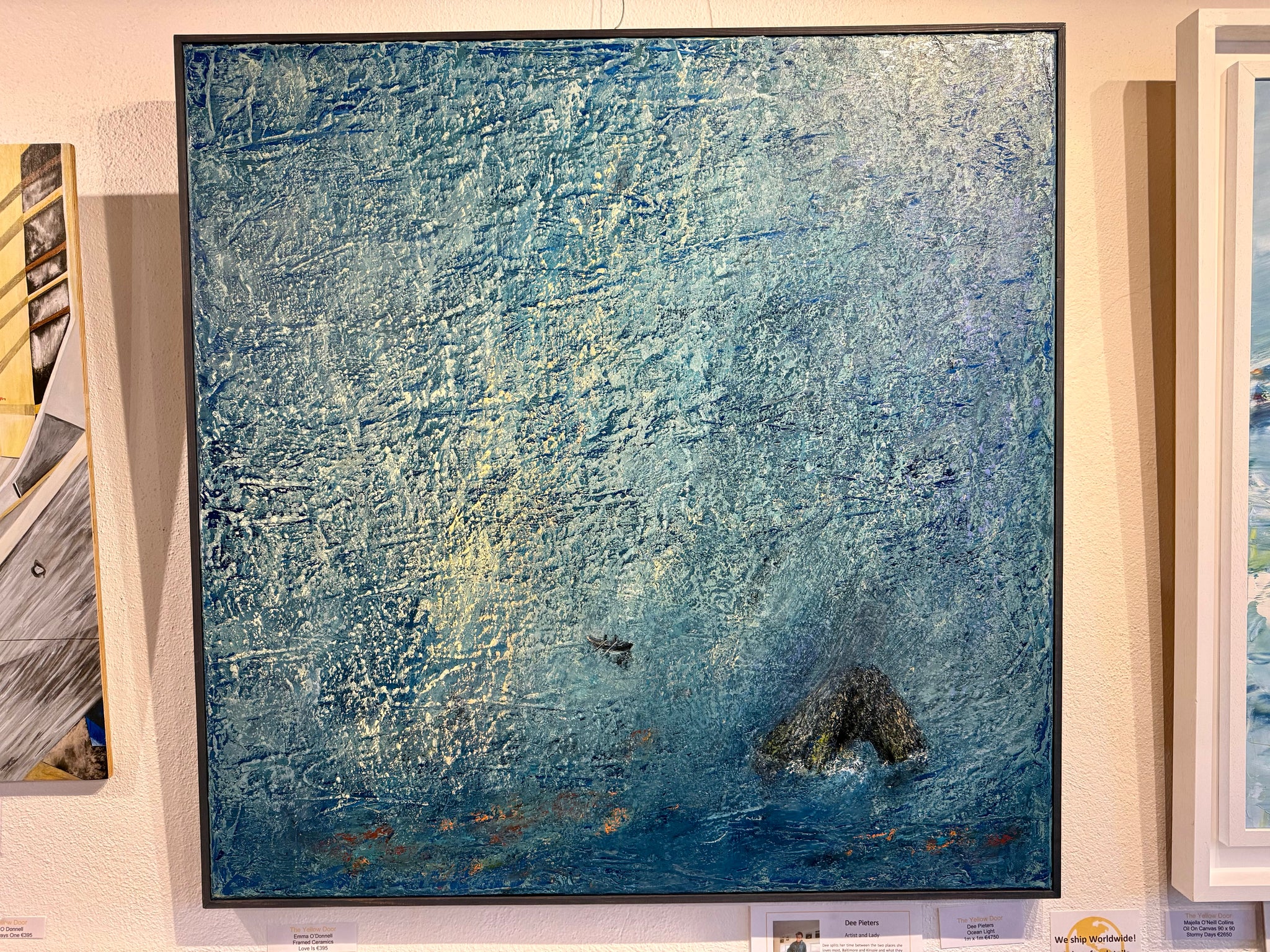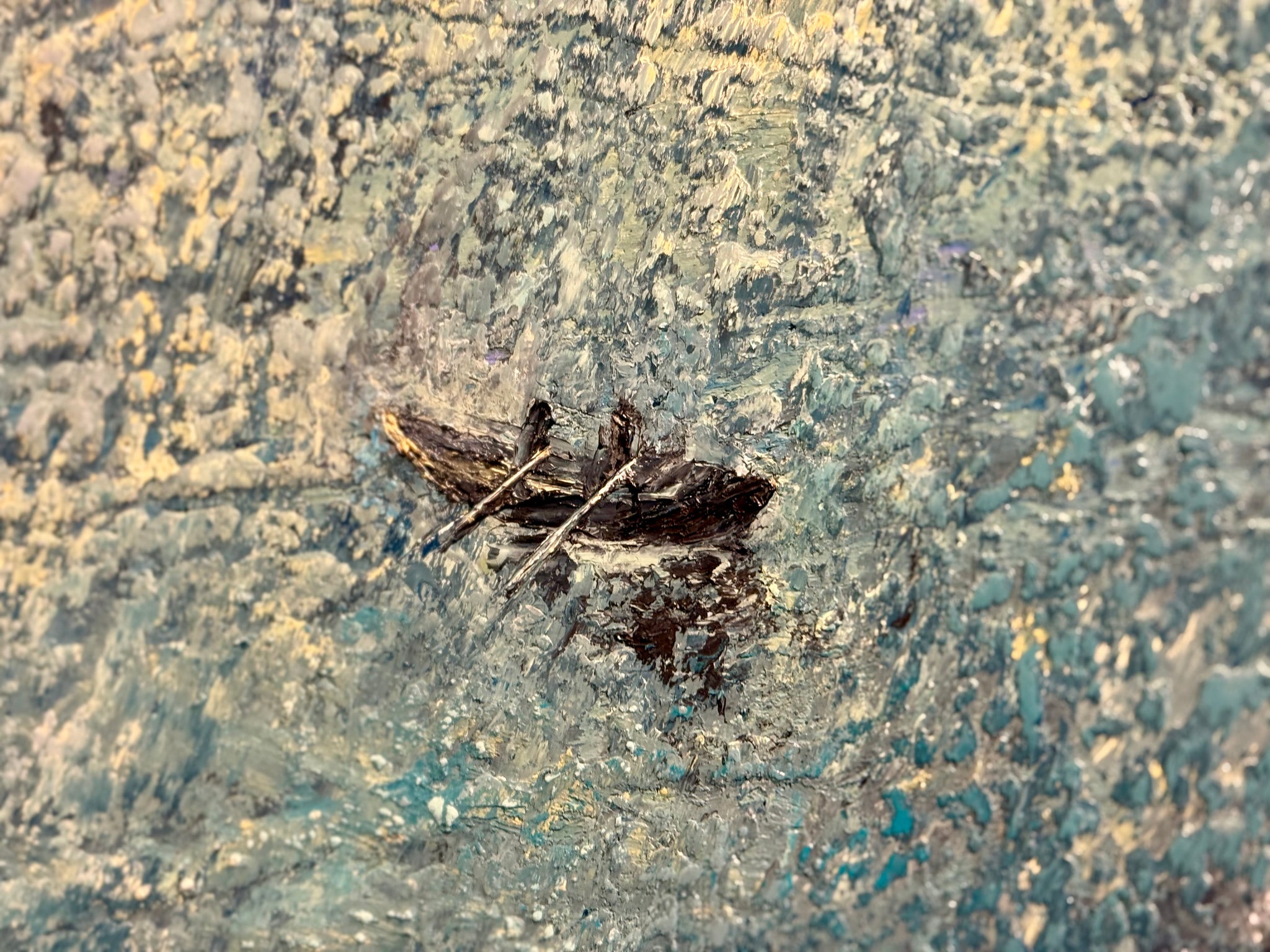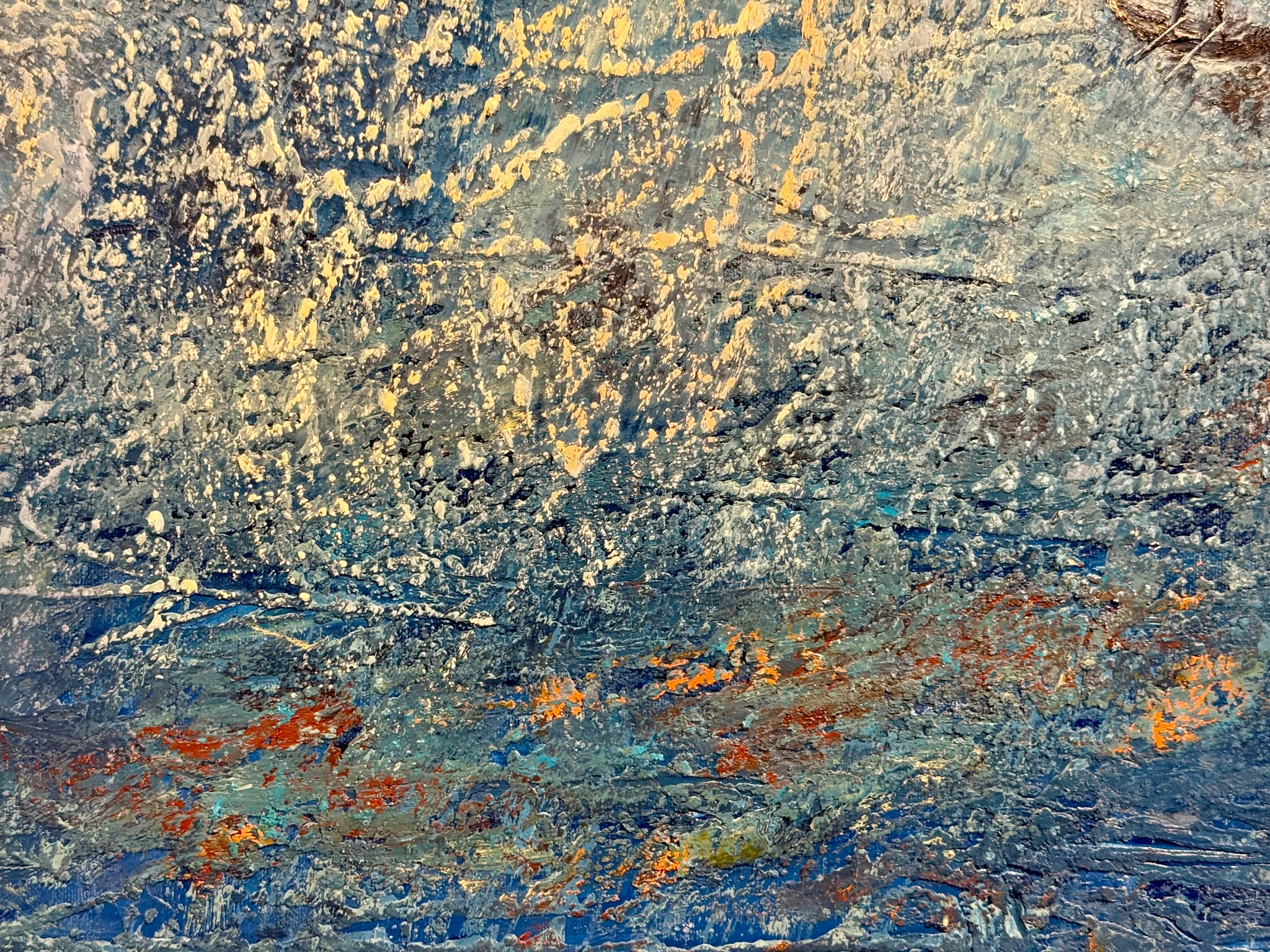 She works in oils mainly with a palette knife, to achieve texture tone & depth.