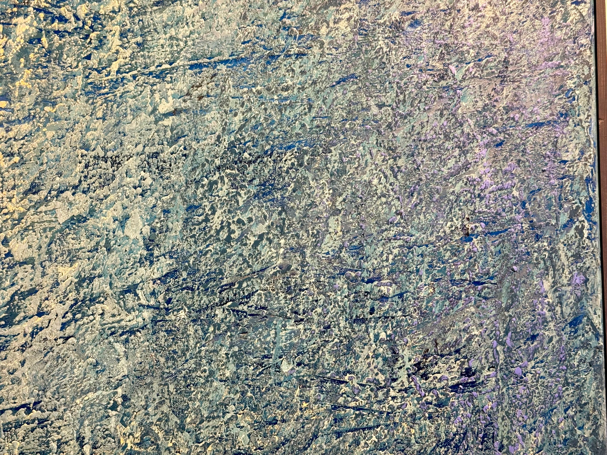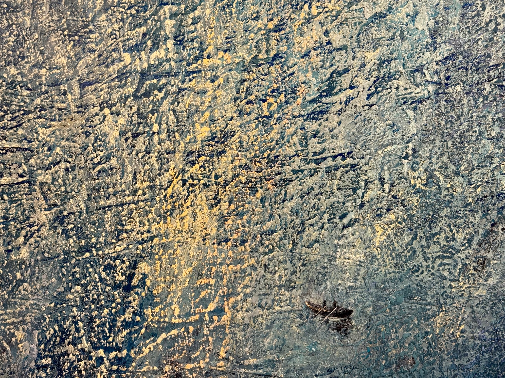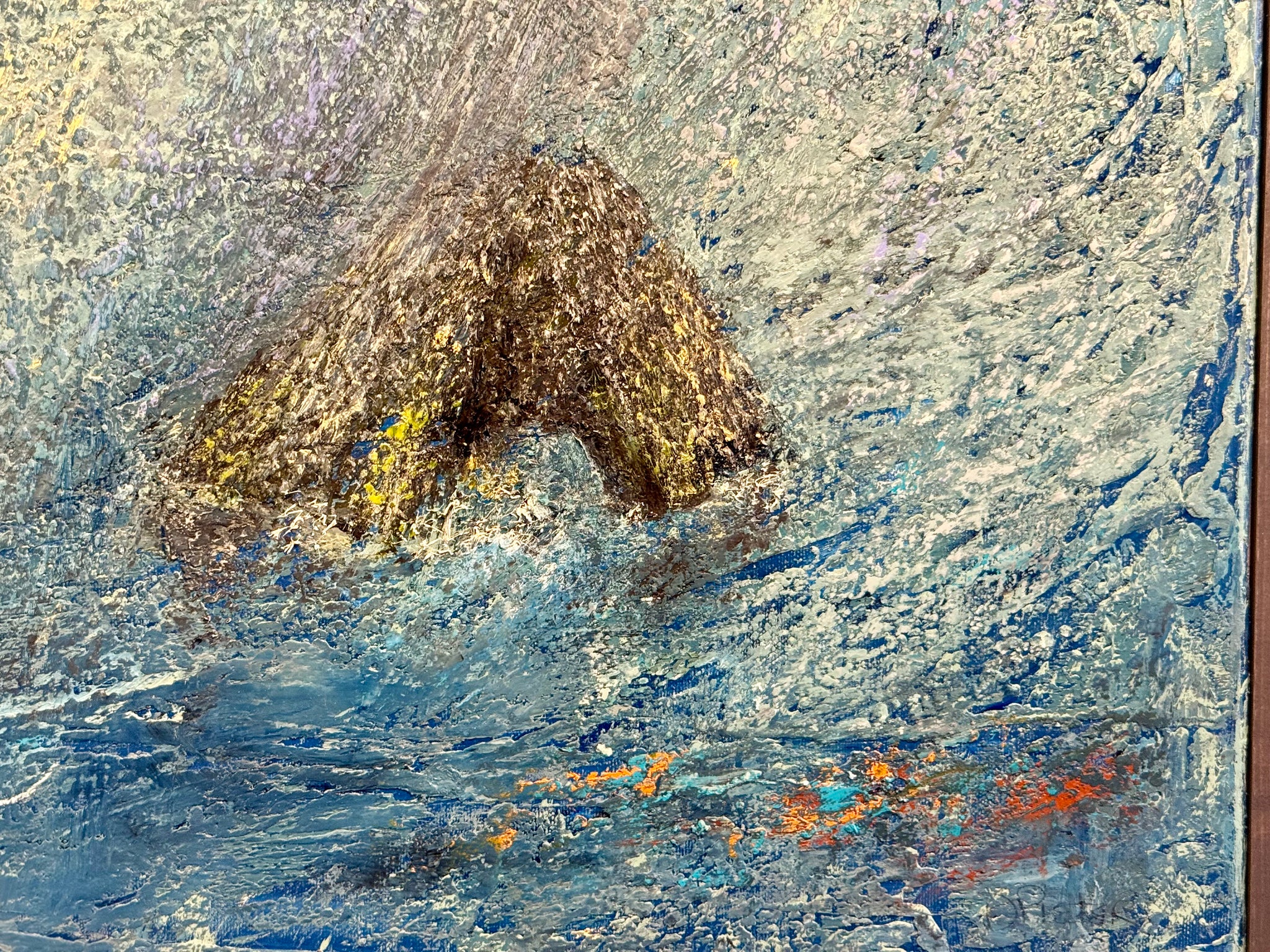 She works in oils mainly with a palette knife, to achieve texture tone & depth.